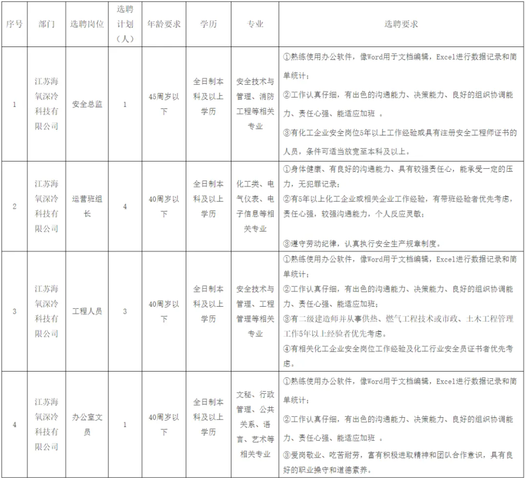江苏海氧深冷科技有限公司是城发集团与杭氧集团合资子公司,公司地址:滨海港经济区颐航大道68号。现企业即将投产运营,为了更好地选才用人,提升人员整体素质,现面向社会公开招聘相关工作人员,有关事项公如下: