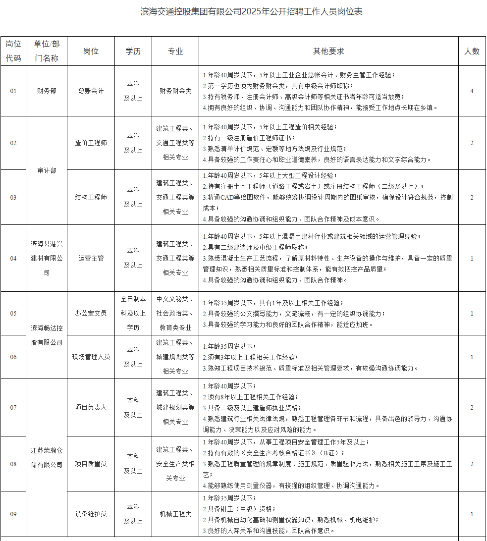 (五)符合《滨海交通控股集团有限公司2025年公开招聘工作人员岗位表》上明确的学历、专业及其他条件。