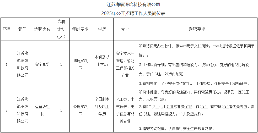 (五)符合《江苏海氧深冷科技有限公司2025年公开招聘工作人员岗位表》上明确的学历、专业、及其他条件。