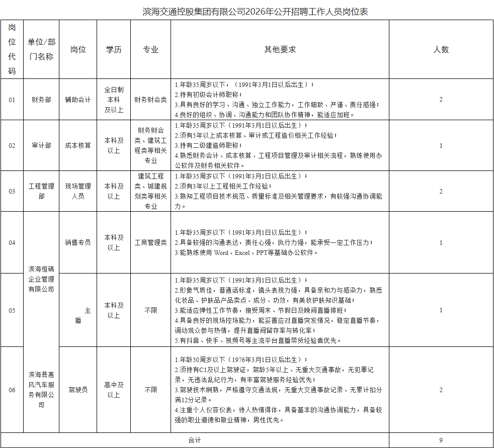 (五)符合《滨海交通控股集团有限公司2026年公开招聘工作人员岗位表》上明确的学历、专业及其他条件。