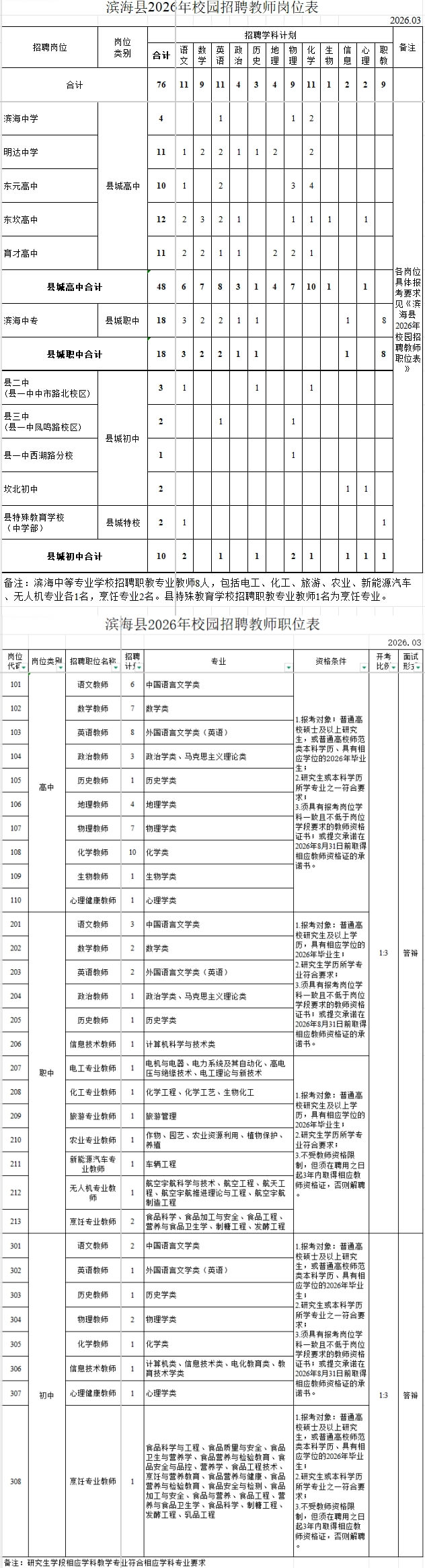 本批次招聘计划76名。具体岗位计划及条件见《滨海县2026年校园招聘教师岗位表》(附件1)和《滨海县2026年校园招聘教师职位表》(附件2)。